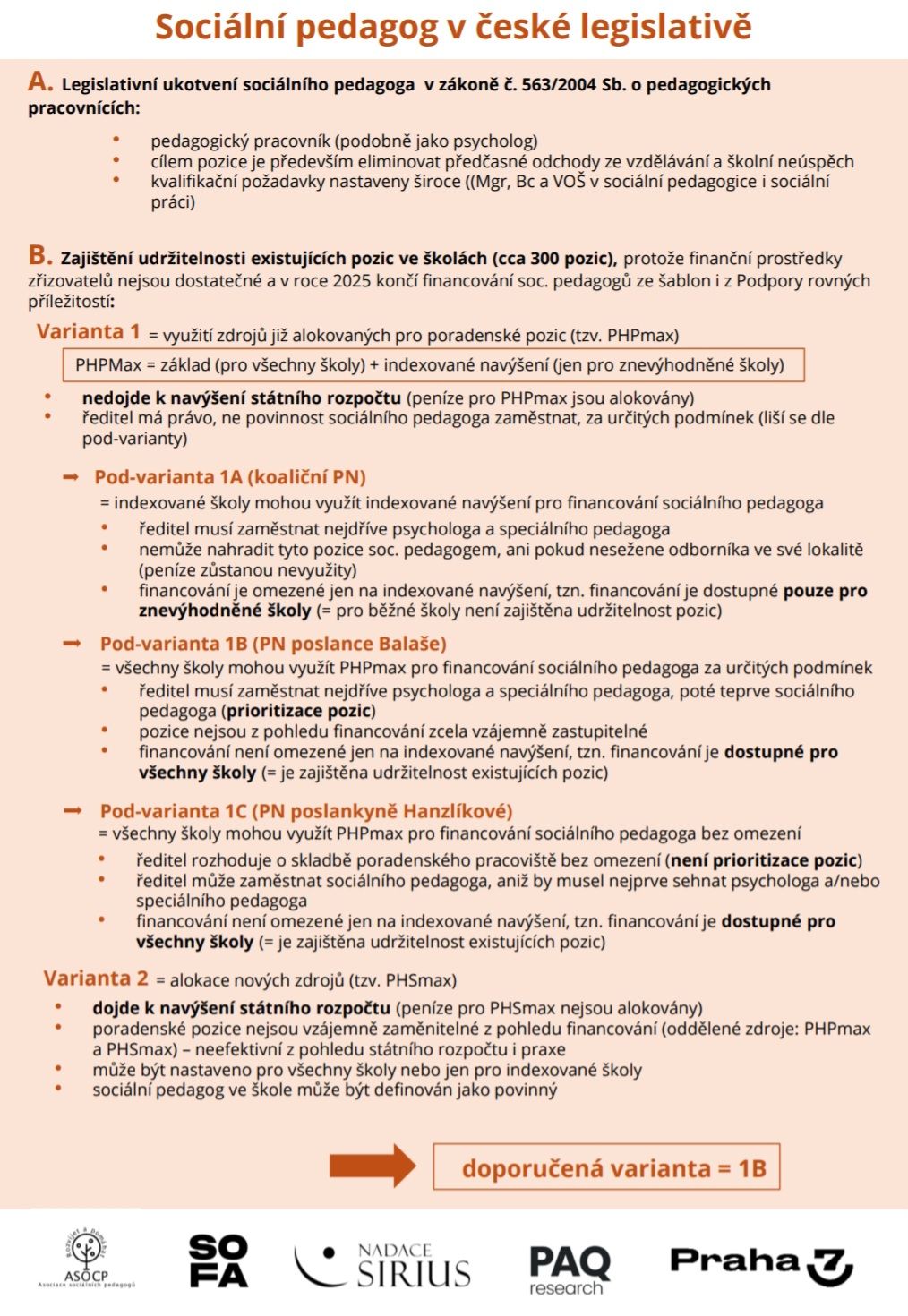 Doporučujeme aktuálně nejrealističtější variantu 1B, protože dává svobodu všem ředitelům (nikoliv jen z indexovaných škol) a přesto zohledňuje prioritizaci pozic, zajišťuje možnost využití pozice sociálního pedagoga dle potřeby škol (včetně již existujících pozic např. ze Šablon) a zároveň nenavyšuje náklady ze státního rozpočtu.